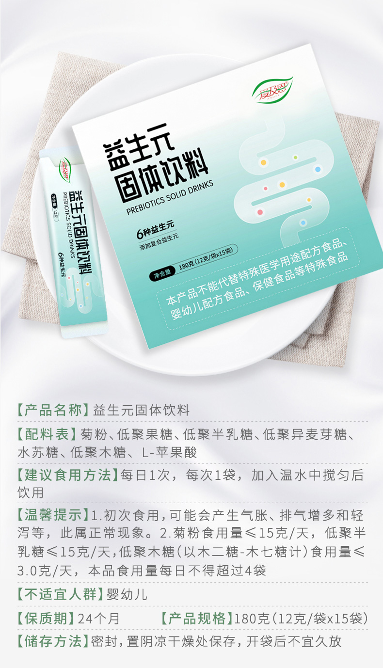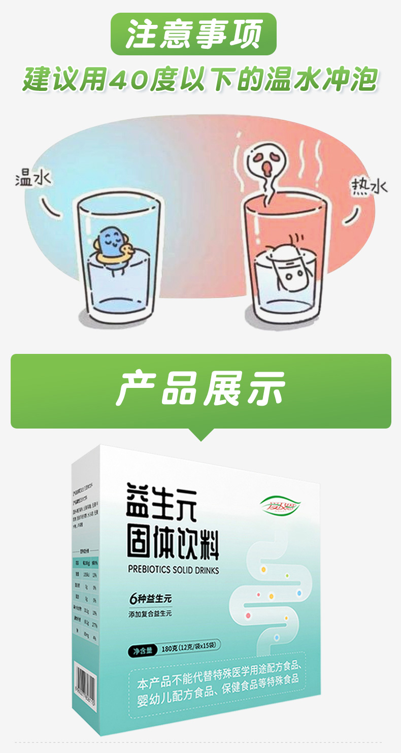 溫馨提示: 1、初次食用(yòng),可(kě)能(néng)會(hΩ€≠¥uì)産生(shēng)氣脹、排氣增多(duō)和(hé)輕瀉∏""等,此屬正常現(xiàn)象。 2、菊粉食用(yòng)量≤15©→克/天,低(dī)聚半乳糖≤15克/天,低(dī)聚木(mù)糖(以木(mù£±×)二糖-木(mù)七糖計(jì))食用(yòng)量≤3.0克/天> €,本品食用(yòng)量每日(rì)不(∞∞¥bù)得(de)超過2袋。