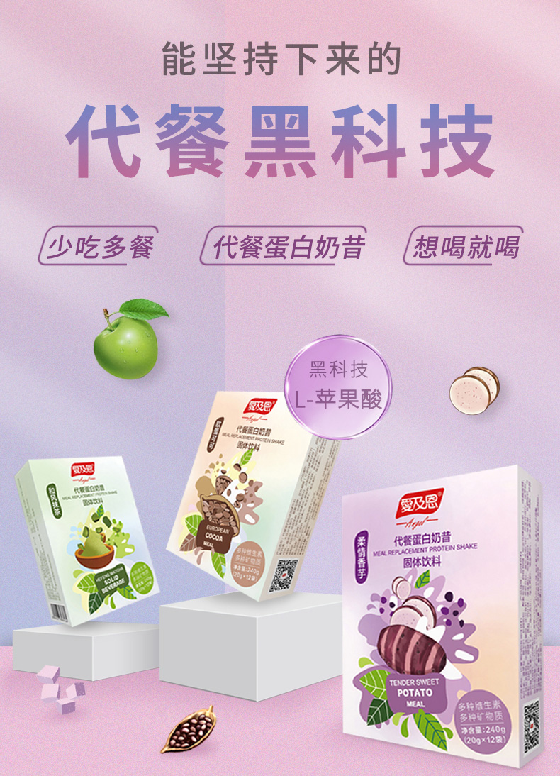 愛(ài)及恩代餐奶昔,我們擁有(yǒu)1種專利成分(fēn),3種優質蛋白(b×&↑ái),5種礦物(wù)質,5種植物(wù)果蔬,10種維♠₹β生(shēng)素,一(yī)袋更是(shì)僅僅79大(dà)卡,低(d♣∞★♠ī)脂低(dī)卡。不(bù)僅營養均衡,蛋白(b÷₩ σái)質、膳食纖維還(hái)充足,喝(hē)& 完滿滿的(de)飽腹感。