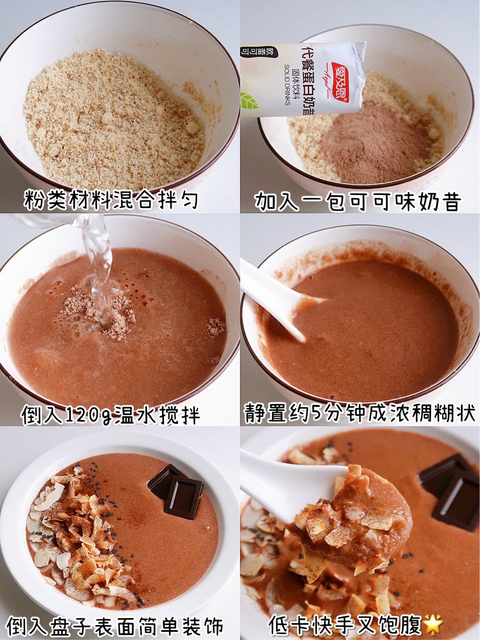 愛(ài)及恩代餐奶昔1袋、杏仁粉5g、亞麻籽粉5g、洋車(₹→&&chē)前子(zǐ)殼粉3g、溫水(shuǐ)、杏仁片、無≤ ∏≤糖椰子(zǐ)片、可(kě)可(kě)粉→★、黑(hēi)巧和(hé)黑(hēi)芝麻(或其他(t'γ €ā)任意喜歡的(de))
